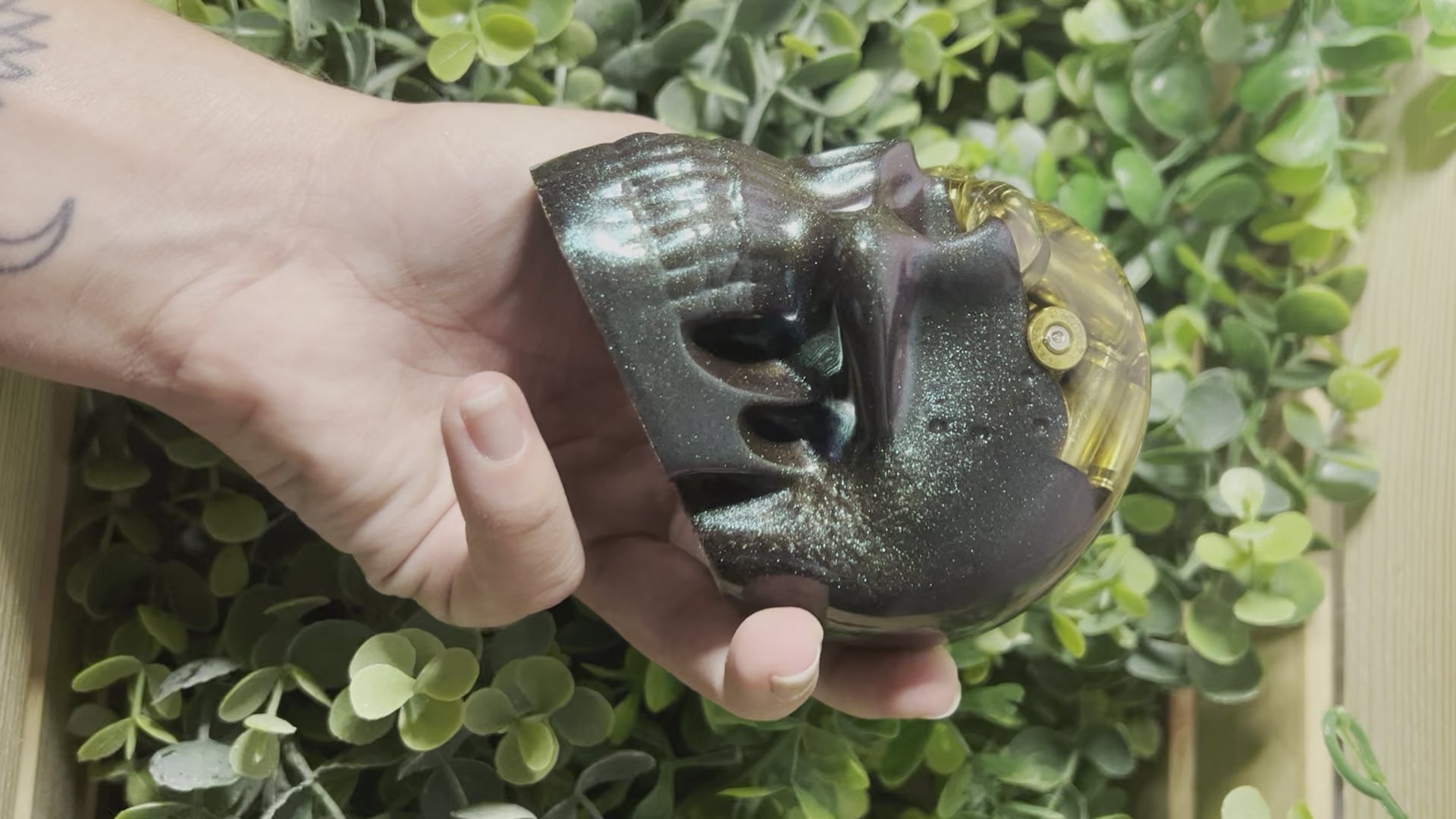Head to the stars with this Metallic Bullet Skull! Crafted with handmade epoxy, this galactic-inspired skull will take you for a breathtaking ride. Unleash your inner risk-taker and achieve new heights with this one-of-a-kind skull.